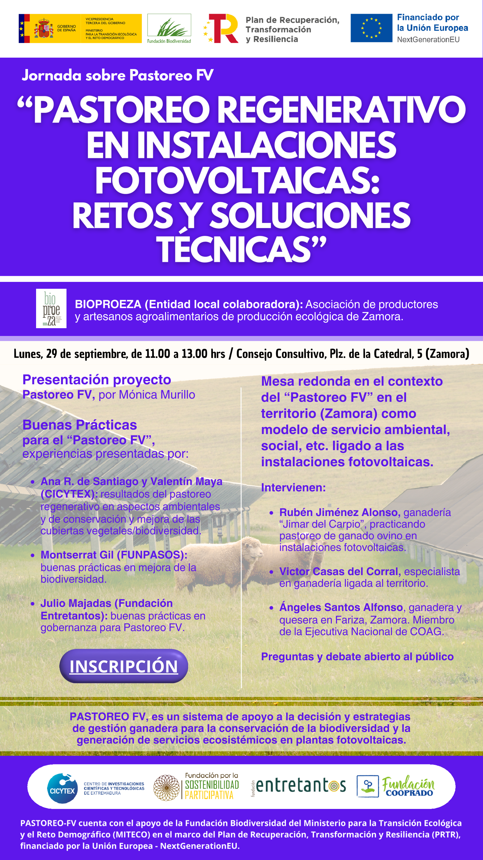 La Fundación Entretantos, dentro del proyecto PastoreoFV, organiza esta jornada, que tiene como objetivo visibilizar y poner en valor buenas prácticas ambientales, sociales y de gestión ganadera, que permitan la articulación de plantas fotovoltaicas mediante un modelo que favorezca la gestión y explotación de espacios de forma conjunta