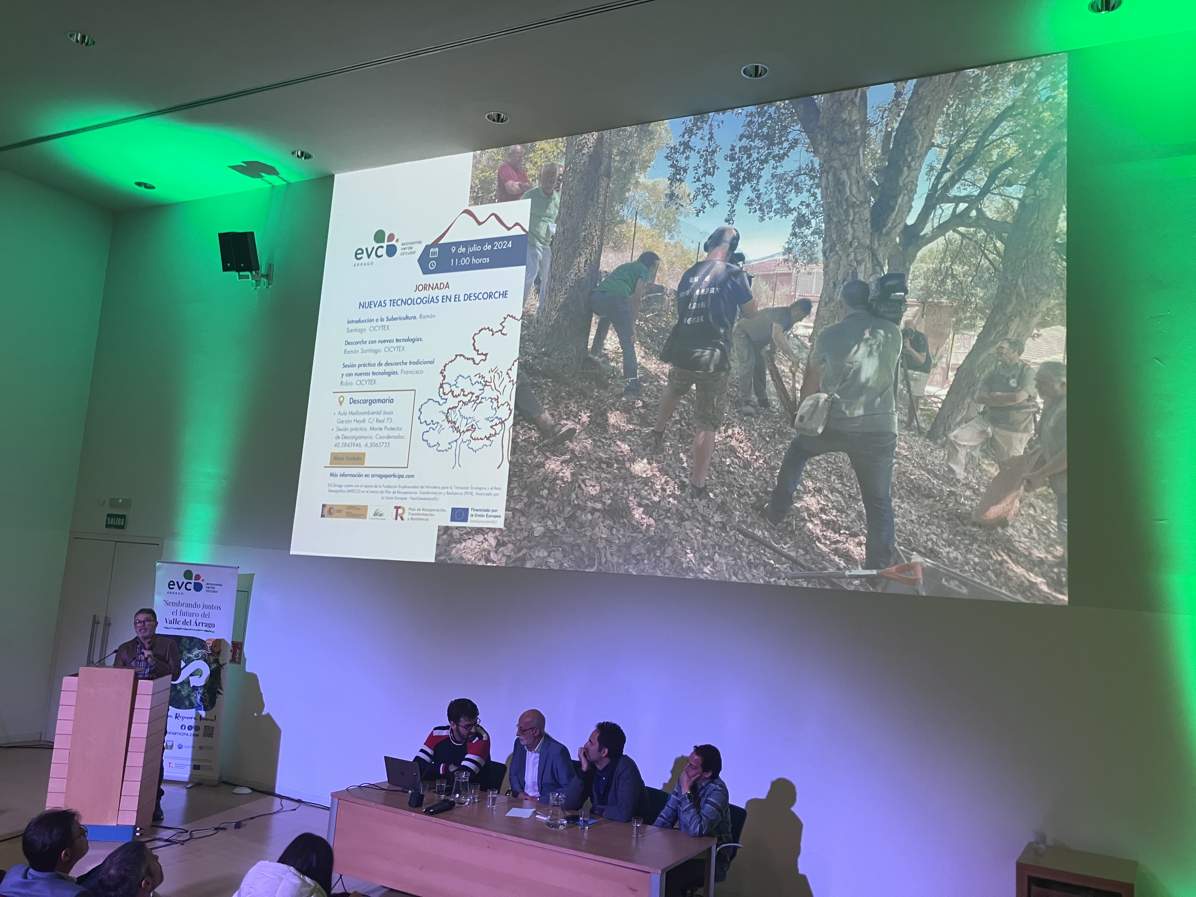 El proyecto EVC (Economía Verde Circular) Árrago ha finalizado con la celebración de una jornada en la que se ha destacado la elaboración de un plan de gestión forestal del monte protector de la localidad cacereña de Descargamaría, donde se han construido cortafuegos productivos en zonas estratégicas. Asimismo, en el ámbito de la subericultura innovadora, gracias a este proyecto se han desbornizado más de 3.000 alcornoques dentro de más de 30 hectáreas. Los cortafuegos productivos incluyen cultivos como el madroño y el castaño, situados en 8 hectáreas que conforman un total de 42 parcelas, así como la recuperación del olivar tradicional, el tratamiento de pinar para resinación, y la instalación de aljibes para el abastecimiento del ganado y riego.