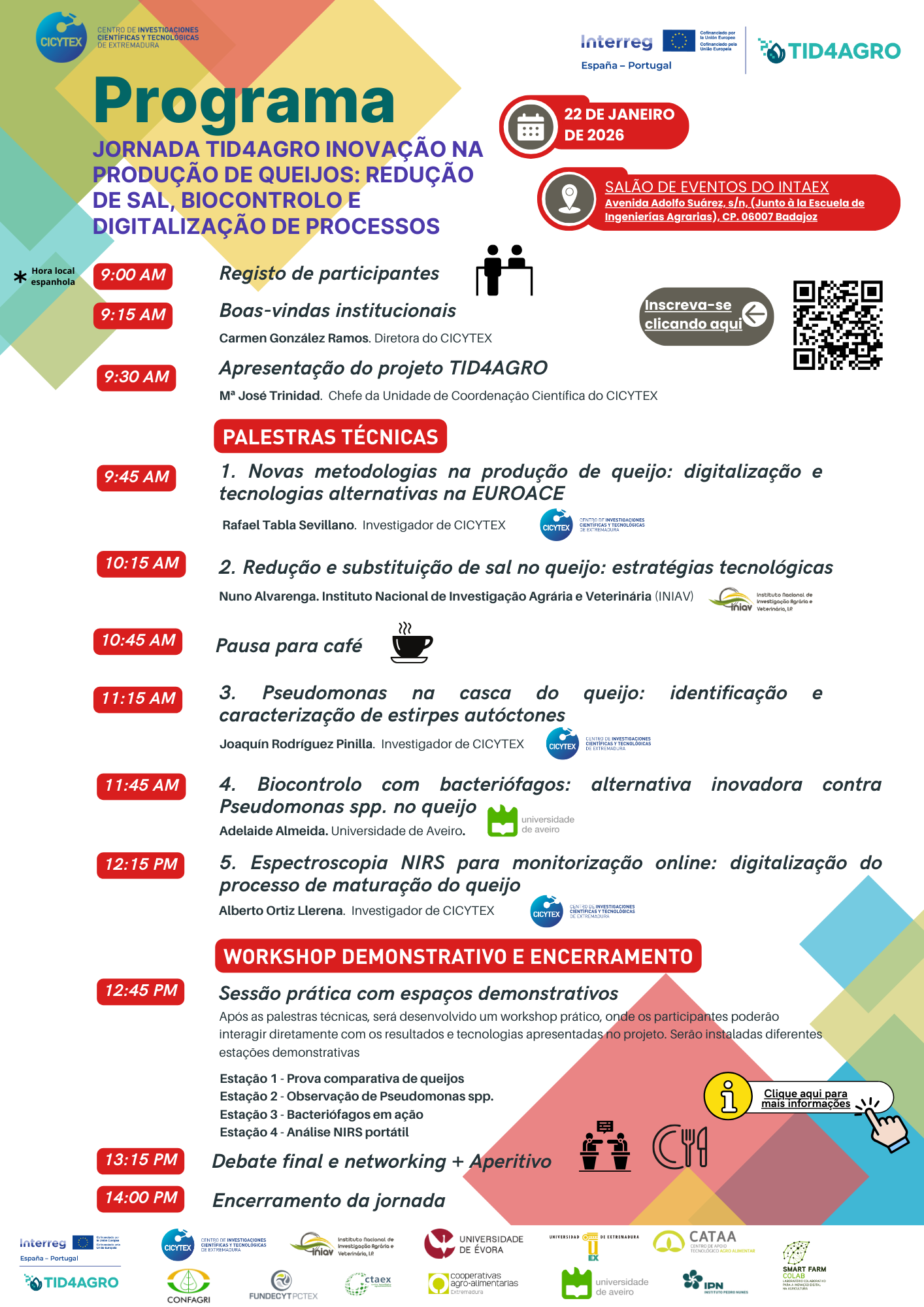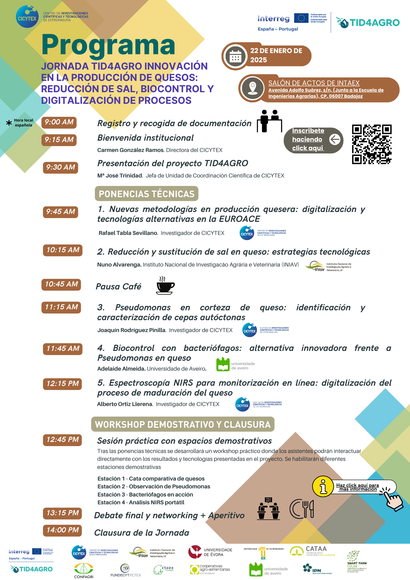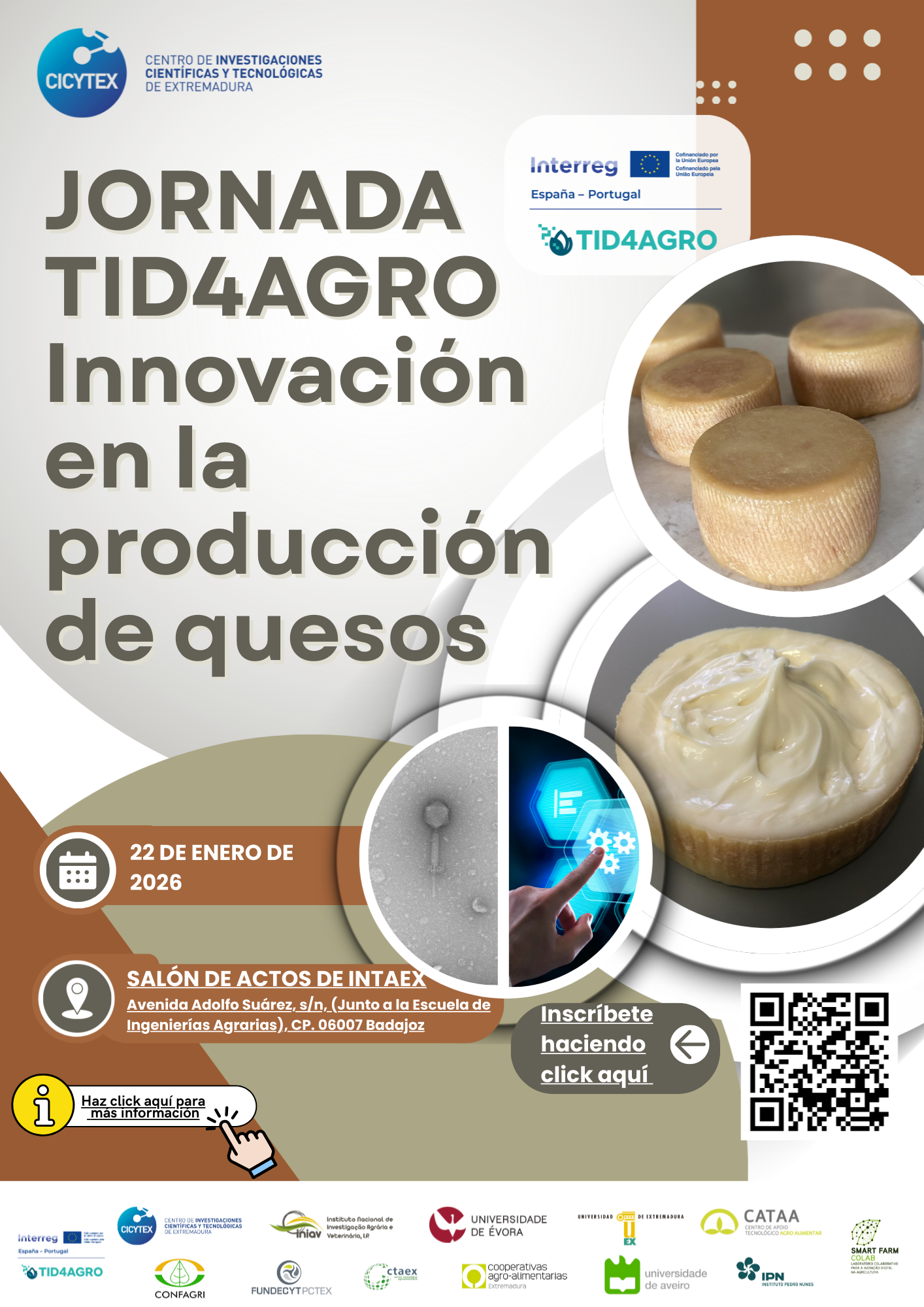 Se presentarán estudios innovadores centrados en tres objetivos clave: reducir el contenido de sal manteniendo las cualidades sensoriales del queso; controlar los microorganismos que causan alteraciones y defectos en el producto; aplicar tecnología de monitorización en tiempo real para optimizar el proceso de maduración. El encuentro, organizado por el área de Lácteos de CICYTEX, forma parte del proyecto transfronterizo TID4AGRO, cofinanciado por el Fondo FEDER, Programa INTERREG VI-A España-Portugal (POCTEP) 2021-2027 de la Comisión Europea.