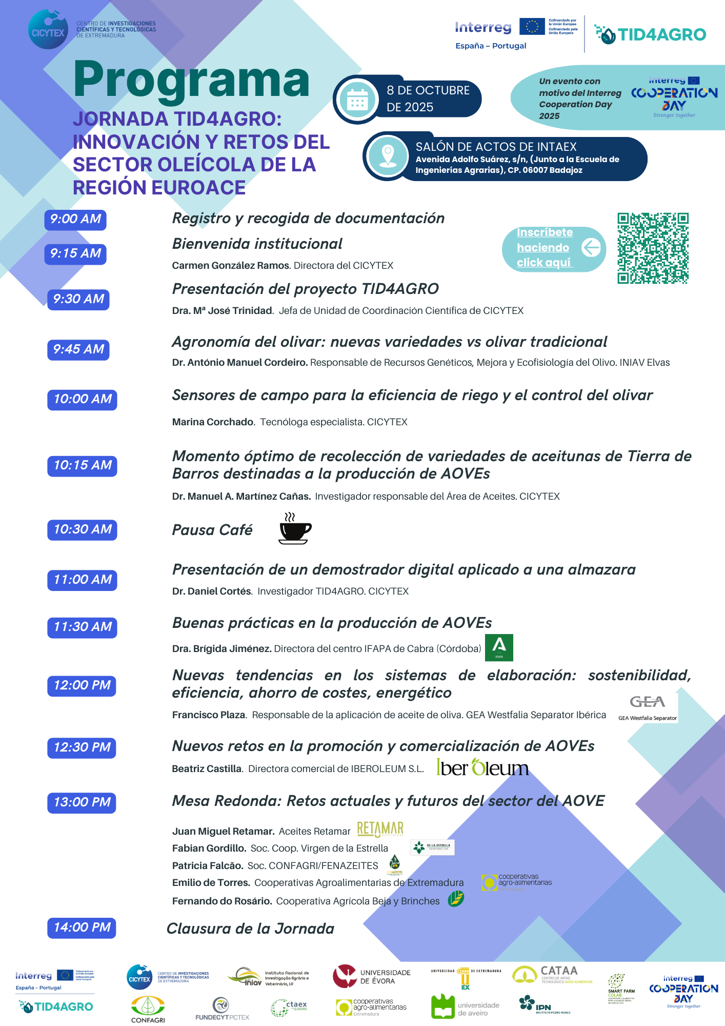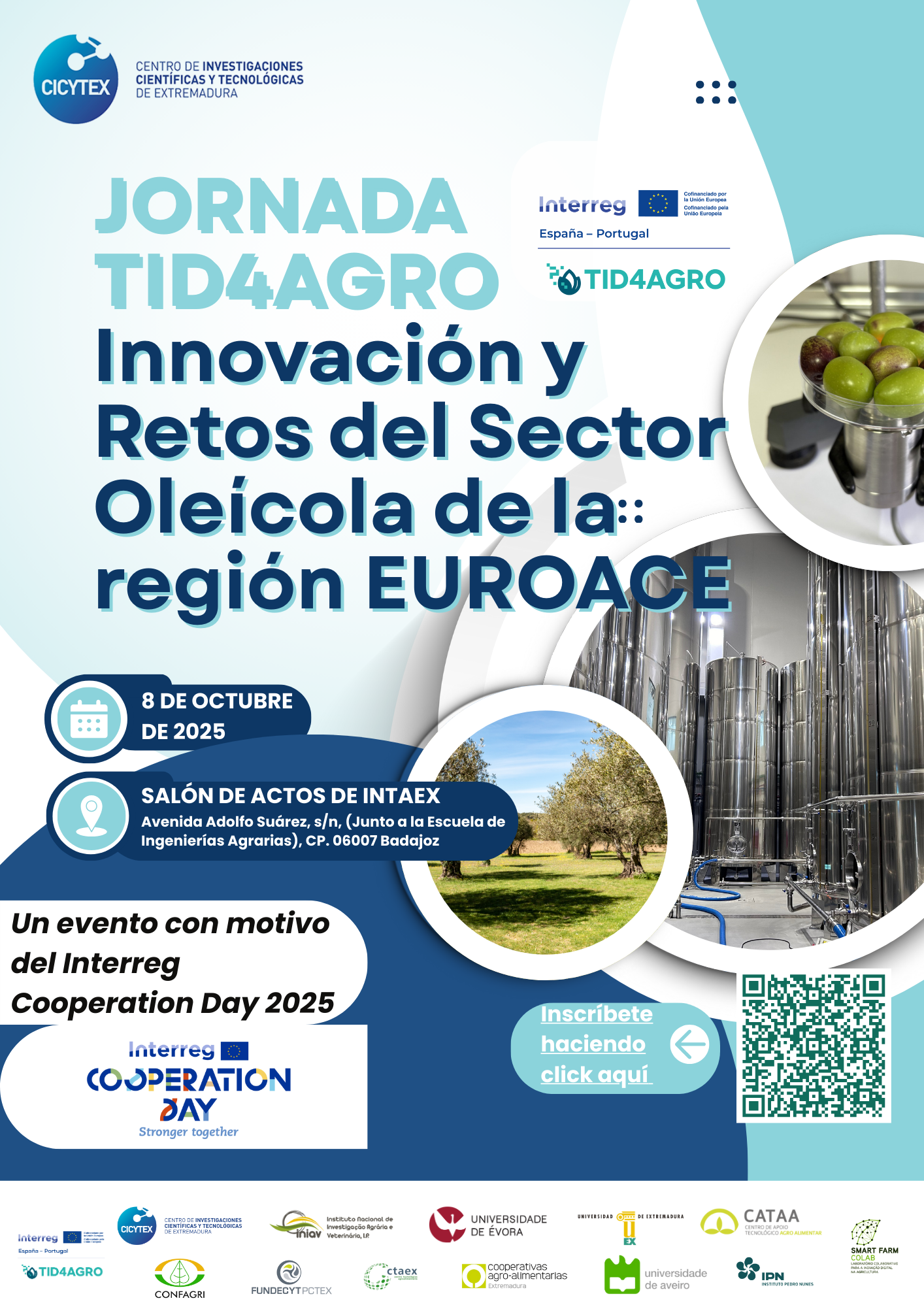 El miércoles, 8 de octubre de 2025, se celebrará la JORNADA TID4AGRO: Innovación y Retos del Sector Oleícola de la región EUROACE, un encuentro diseñado para mostrar cómo la digitalización y las nuevas tecnologías pueden transformar el sector oleícola y hacerlo más competitivo y sostenible. Tendrá lugar a partir de las 9:00 horas, en el salón de actos de INTAEX (Badajoz)