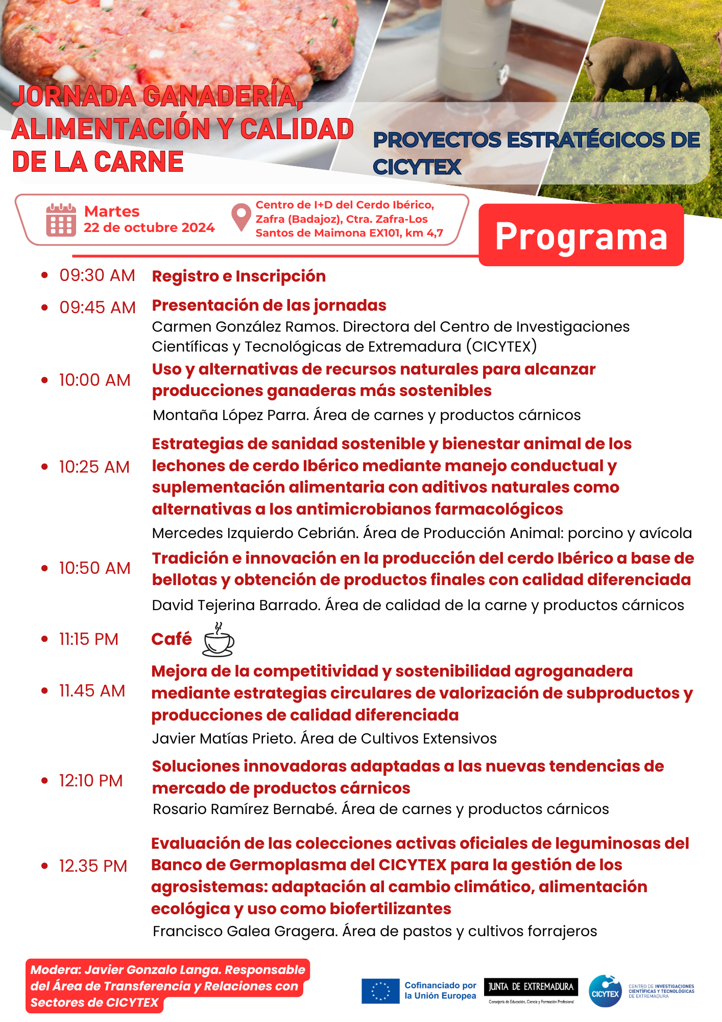 La jornada comenzará a las 9:30 horas. Tras la presentación por parte de la directora de CICYTEX, Carmen González Ramos, intervendrán las personas responsables de cada proyecto. Por orden de intervención son las siguientes: Montaña López Parra, Mercedes Izquierdo Cebrián, David Tejerina Barrado, Javier Matías Prieto, Rosario Ramírez Bernabé, Francisco Galea Gragera.