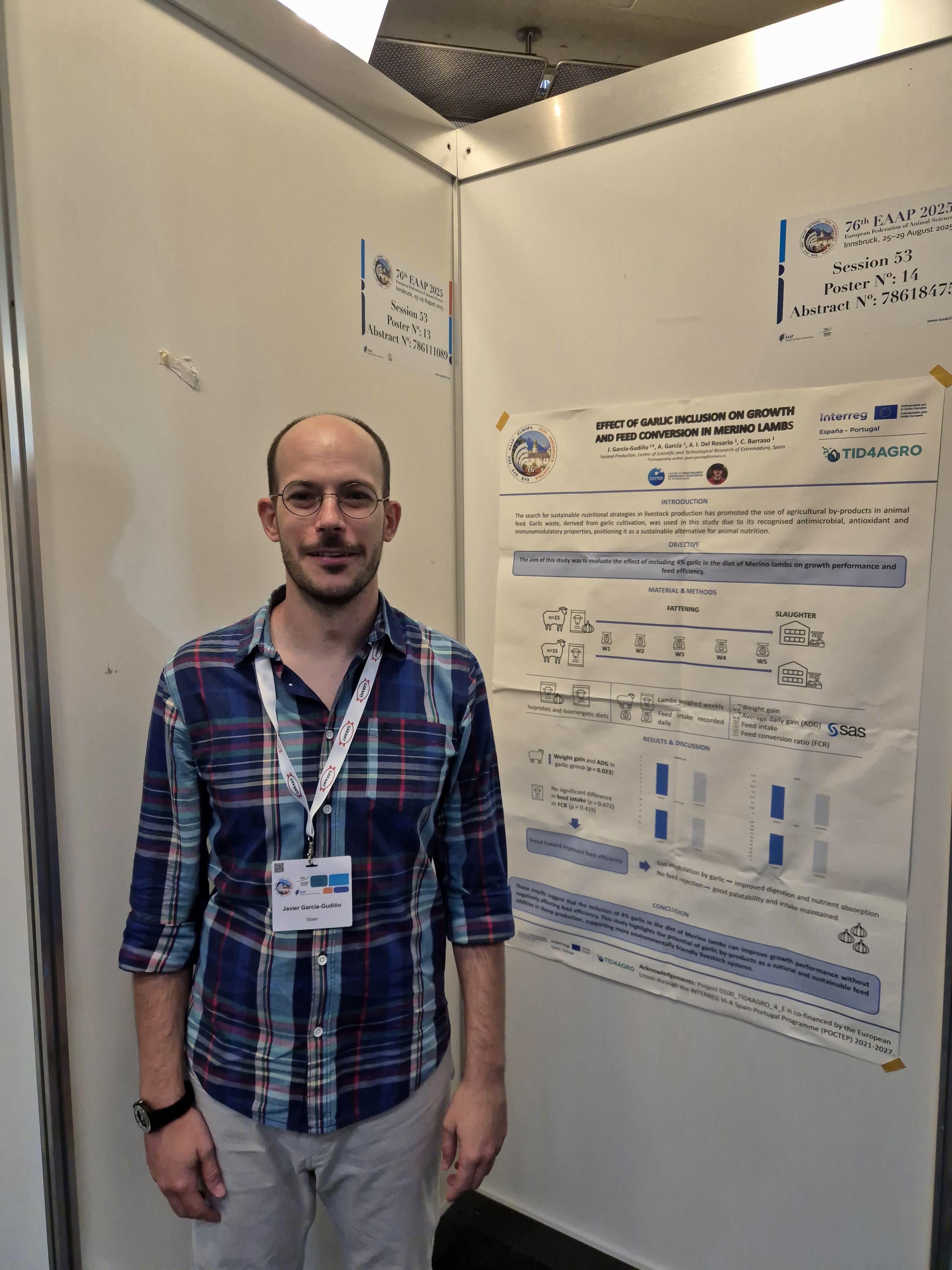 García Gudiño ha intervenido con dos comunicaciones en formato póster y una de ellas lleva por título ‘Efecto de la inclusión de ajo en el crecimiento y conversión de alimento en corderos merino’, dentro del marco del proyecto europeo TID4AGRO, Tecnologías avanzadas, innovadoras y digitales para el sector agroalimentario de la EUROACE (Financiación Fondo Europeo de Desarrollo Regional (FEDER) a través del Programa INTERREG VI-A España-Portugal (POCTEP) 2021-2027 de la Comisión Europea).