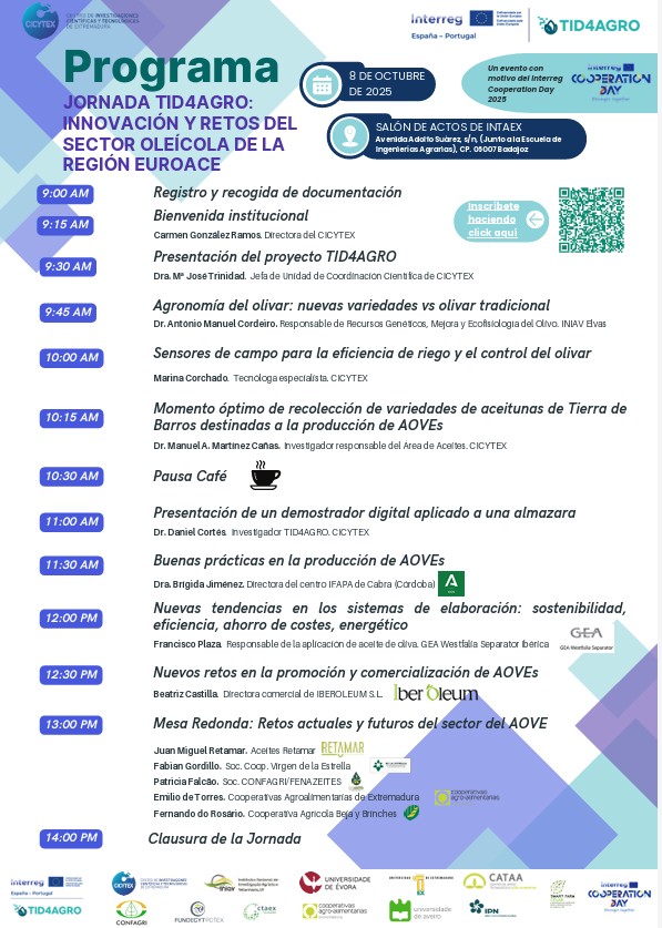La jornada contará con la participación de otros socios del proyecto TID4AGRO, el responsable de Recursos Genéticos, Mejora y Ecofisiología del Olivo (INIAV- Instituto Nacional de Investigação Agrária e Veterinária), António Manuel Cordeiro, centrará su comunicación en la agronomía del olivar: nuevas variedades vs olivar tradicional.