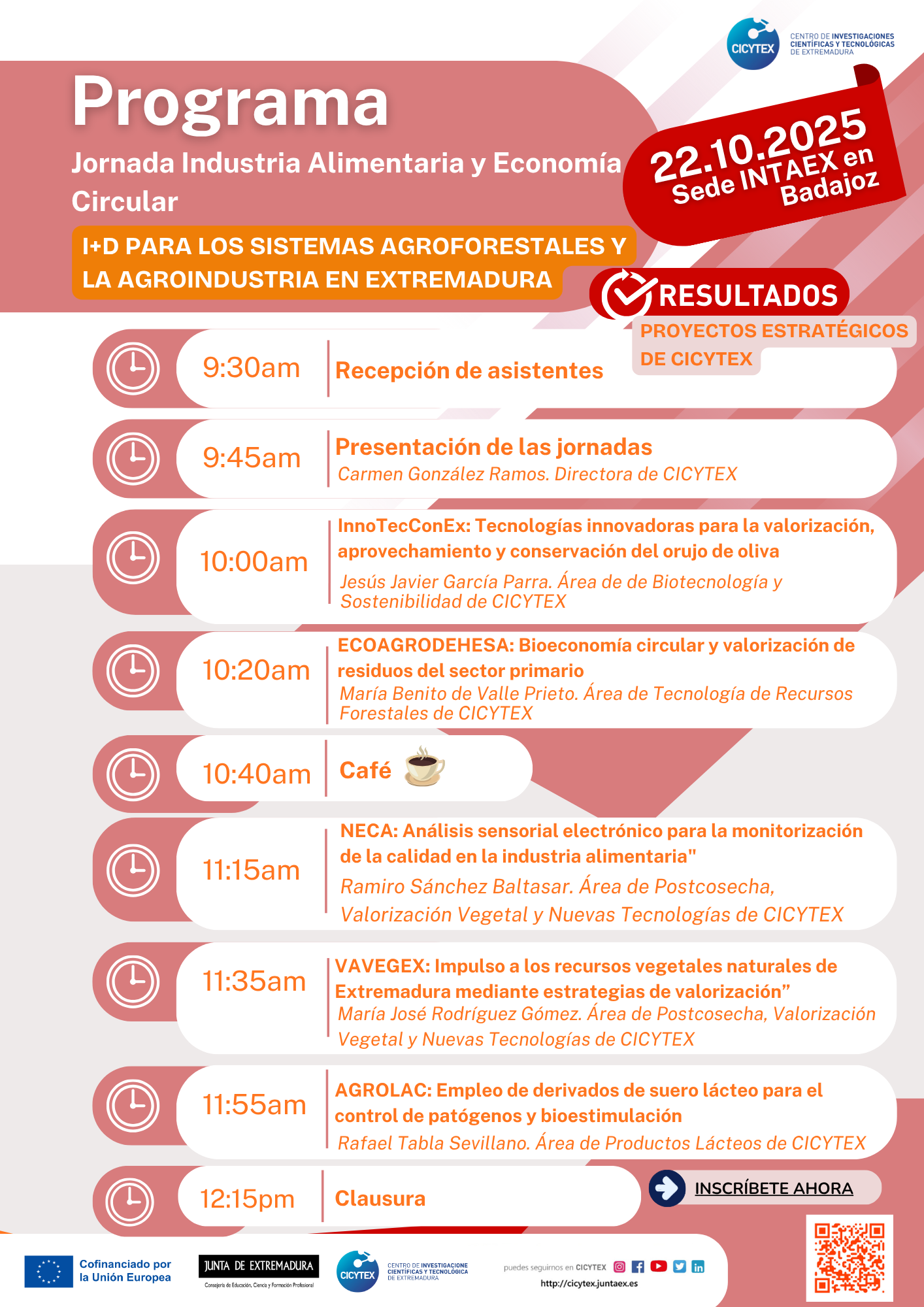 La jornada comenzará con la presentación de la directora de CICYTEX, Carmen González Ramos y continuará con una presentación de los resultados y estudios realizados en cada proyecto: